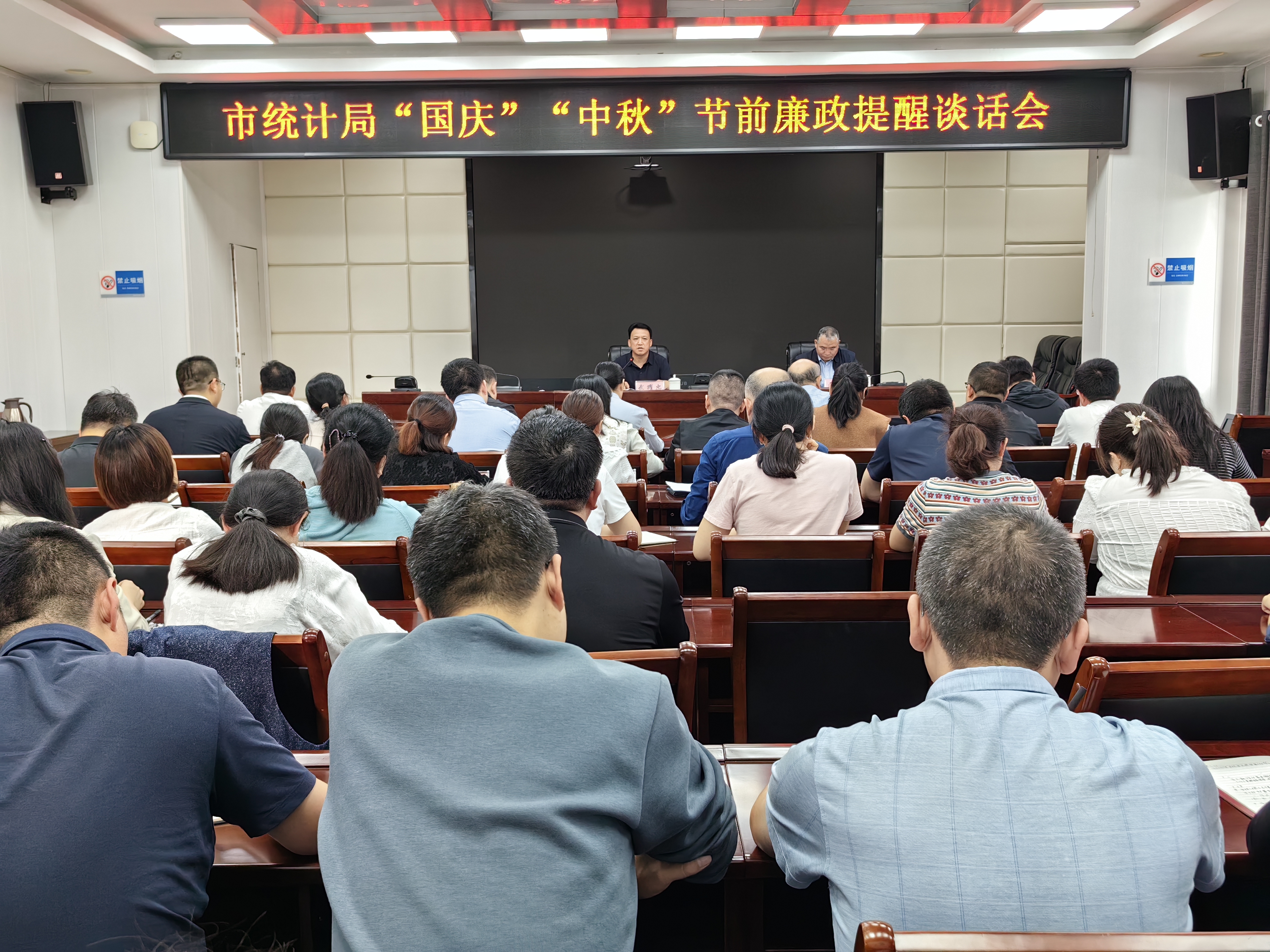 为进一步严明国庆、中秋假期的政治纪律和政治规矩,持续巩固深入贯彻中央八项规定精神学习教育成果,锲而不舍落实中央八项规定精神,推动作风建设常态化长效化,9月29日,临汾市统计局召开“国庆、中秋”节前廉政提醒谈话会。局党组书记、局长武耀忠主持会议并讲话。市纪委监委驻市发改委纪检监察组组长张峰出席会议并讲话,局班子成员、市统计局和省属监测中心全体人员参加会议。